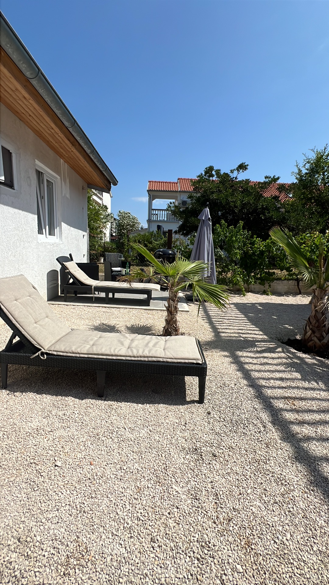 Apartmán s dispozicí 2+KK ( max. 2 osoby) je situován v zadní části domu, přímo u krásných palem, kde je pro hosty připraveno soukromé posezení, grill a lehátka.
